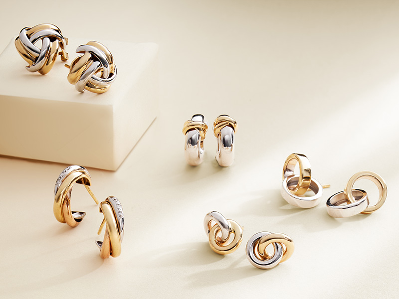 Jewellery in mixed metals creates playful contrasts and a modern style. In the store, you will find two- and three-tone earrings in a variety of designs. Discover stud earrings, hoops and drop earrings in gold, white gold and rose gold.