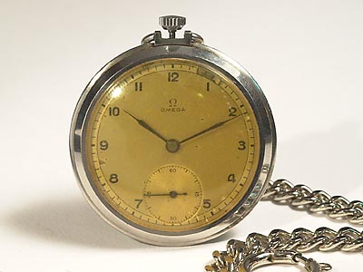 OMEGA, pocketwatch, steel, damaged dial, chain in metal