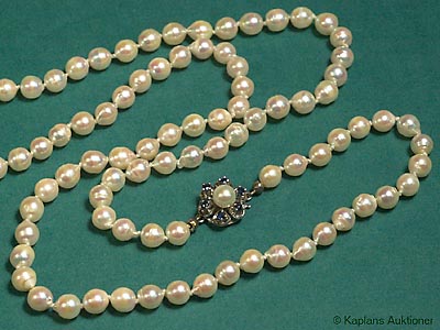 PEARLNECKLACE, cultured pearls, approx 5,4-5,8 mm, length 64 cm, clasp in silver with sapphires