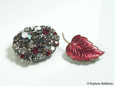 2 BROOCHES, 1 in base-metal with costume jewellery, 1 in base-metal in shape of a leaf.