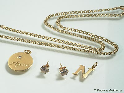 1kedja bismarck (def) approx 45cm 14k:4,5g,1grav hänge,2örhängen, 1hänge/"N"18k:2,8g. weight 7,3g