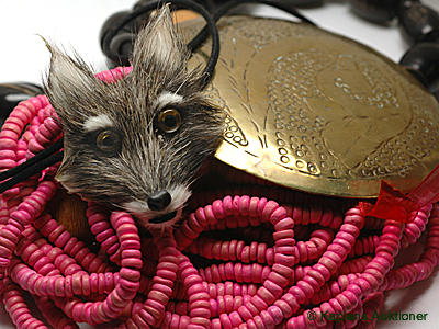 VARIOUS PCS OF JEWELLERY, 3 necklace, 1 brooch, horn, wooden m.m