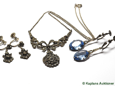 NECKLACE, silver with gals sternar, 2 pair EARRINGS crystal stones, screw-fittings.