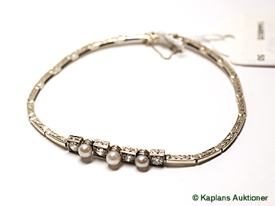 1 bracelet vg with dia tot approx 0,55ct (varierad slipning, 1 m nagg) and pearls, approx 19cm, 18K. weight 7,4g