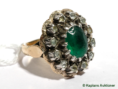1 ring with green & white stones, stl:17, 18K. weight 6,1g