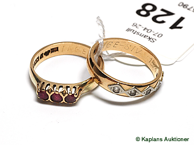 1 ring, engraving, with red stones, 1 ring, engraving, with white stones, 18K. weight 8,9g