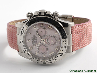 ROLEX, Oyster Perpetual, Cosmograph Daytona, Chronometer, Ref no. 116519, Serial no. Y587523, chronograph, men´s wristwatch, 40 mm, 18K white gold, self-winding, sapphire crystal, mother-of-pearl-dial, leatherstrap, folding clasp 18K white gold, Ref no. 16519-D, cert (not signed), approx 2003, case.Former owner of this watch is "Rolex Ambassador" Catrin Nilsmark, Golfpro.