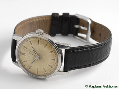 IWC, men´s wristwatch, 34,5 mm, Cal 852, Serial no. 1382574, Case no. 1411284, steel "staybrite", self-winding, plastic crystal, damaged dial, leatherstrap, approx 1956.