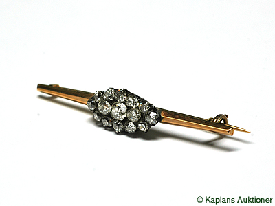 BROOCH, 14K gold and silver with 15 old- and antique-cut diamonds approx 1,15 ctw, approx TCr/SI, weight 4,0 g, case.