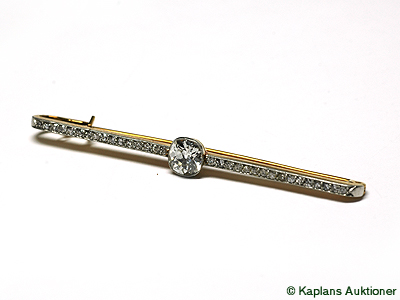 BROOCH, 18K gold and platinum, antique-cut diamond approx 0,90 ct, approx W-TCr/VS2-SI1, and 32 small older single-cut diamonds approx 0,32 ctw, approx W/SI, weight 4,3 g, original case.