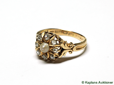 ANTIQUE RING 18K gold, cultured half pearl (damaged) and 8 rose-cut diamonds, made in 1904, ringsize 16 3/4, weight 4,8 g.