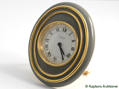 CARTIER, Paris, alarm-clock, 84 x 100 mm, Cal 949, Serial no. 17203, Ref no. 7512 Case no. 07922, base metal/plastic, mechanical, plastic crystal, alarm, imperfect, approx 1985.