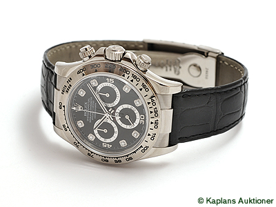 ROLEX, Oyster Perpetual, Cosmograph, Daytona, Chronometer, Ref no. 116519, Serial no. D598085, chronograph, men´s wristwatch, 18K white gold, self-winding, sapphire crystal, diamonddial, leatherstrap, foldingclasp 18K white gold, Ref no. 16519, cert, May 2006, case, paper box.