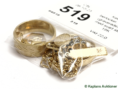 chain, 6 charms, 2 rings (engraved), ring with black stone. 18K. weight 22g