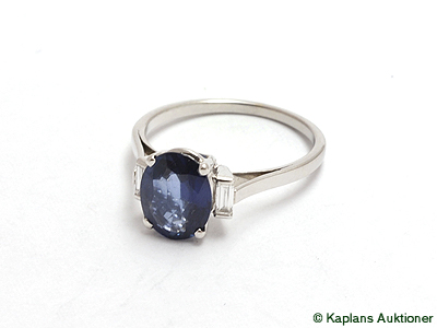 RING, 18K white gold, blue sapphire approx 1,70 ct, 2 baguetter approx 0,18 ctw, approx TW/VS, ringsize 16,5 mm, weight 2,5 g.