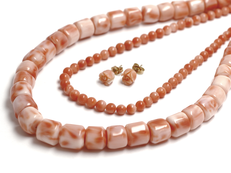 2 NECKLACE, 1 PAIR EARRINGS, coral, pushback in 18K gold length 53 and 41 cm.