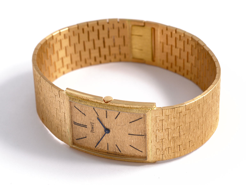 PIAGET, men´s wristwatch, 24,5 mm, Cal 9P, Serial no. 621555, Ref no. , Case no. 171964, 18K gold, manual, sapphire crystal, integrated original bracelet, length 205 mm, total weight 91,7 gram, approx 1975.