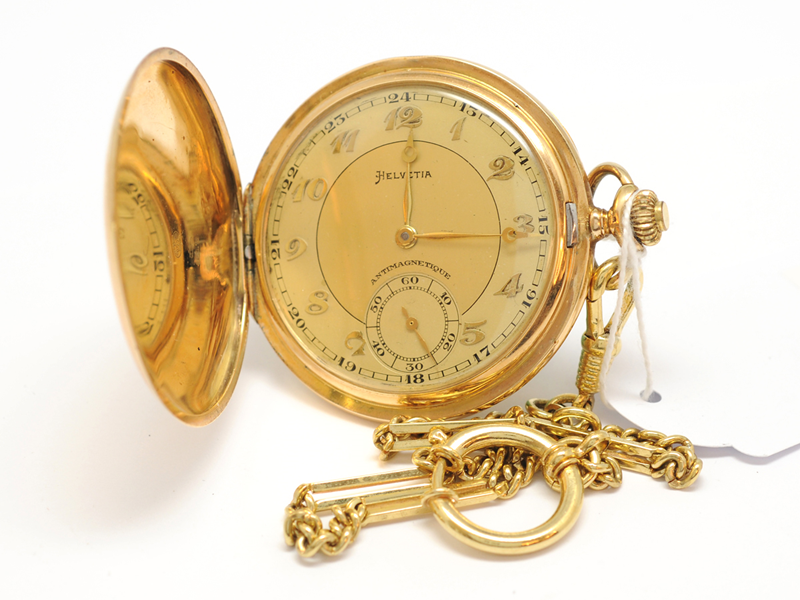 Pocketwatch, Helvetia Antimagnetique, manual, 2 Boetter 14K, 1 cuvett in metal no 3853818, engraved. small dents on bakboetten, kedjan not in gold, worn dial