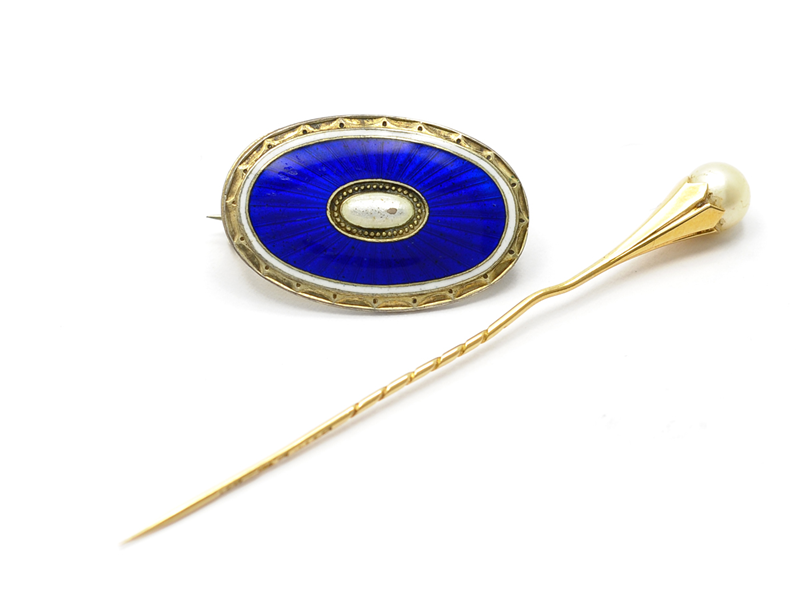 TIEPIN/BROOCH, 18K gold (tiepin) with 6,3 mm cultured pearl, Malmö 1923, silverbrooch with blue and white enamel (some marks in the enamel), case.