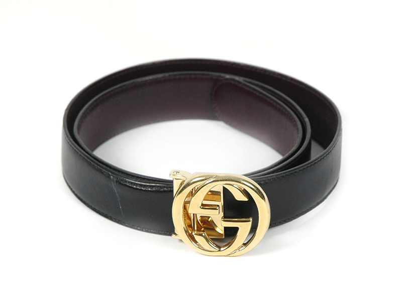 SKÄRP, GUCCI vändbart svart/vinröd gulmetallspänne 90 cm