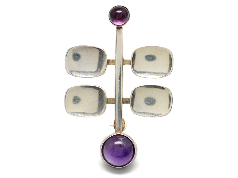 BROOCH, silver, 2 amethysts, inclusion as reaches the surface, weight 14,8 g, Saarela Arvo, Enköping 1963.