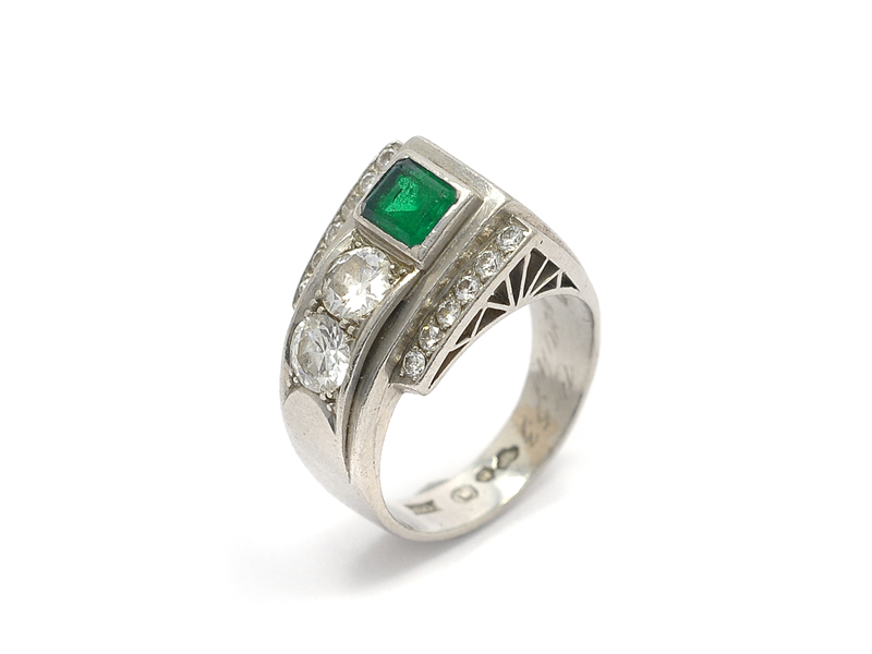 RING, PLATINUM, emerald, (notch), 2 medium cut diamonds approx 0,50 ctw, approx TW/VS 11 medium cut diamonds approx 0,12 ctw, approx TW/VS, size 15.5 mm, engraving, weight 9,2 g.