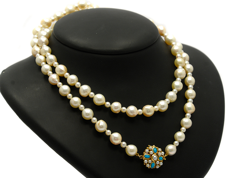 PEARL NECKLACE, cultured pearls, baroque 9 mm, round 4 mm, 18K goldclasp with turquoises and pearls, length 113 cm.