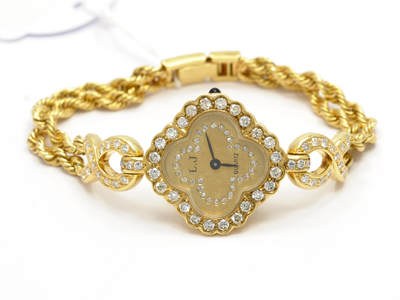 Ladie´s wristwatch, LJ, 18K quartz, working not, diakrans, diaindex, with integrated bracelet double "twisted rope-link" with diamonds, tot.18cm, brv.38,9g