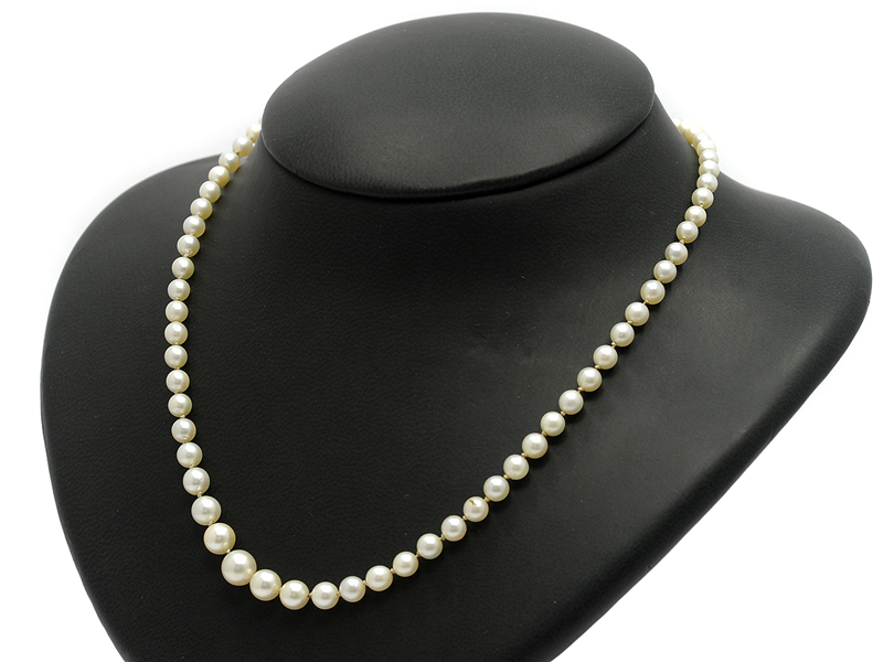 PEARL NECKLACE, graduated 3,6 - 6,8 mm, length 53 cm, clasp in 18K gold (small pearl missing in clasp).