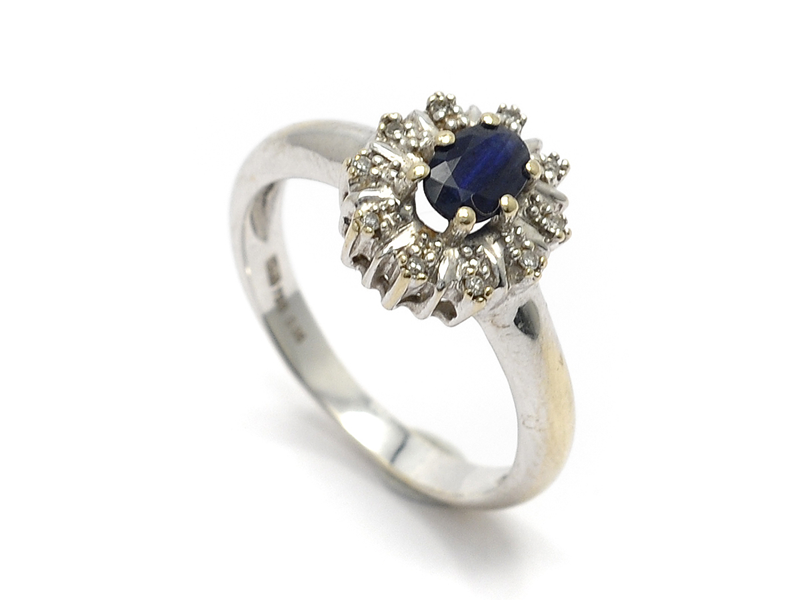 CLUSTER RING, 18K white gold, sapphire approx 0,50 ct, 10 eight cut diamonds approx 0,05 ctw, size 18 mm, weight 4,5 g.