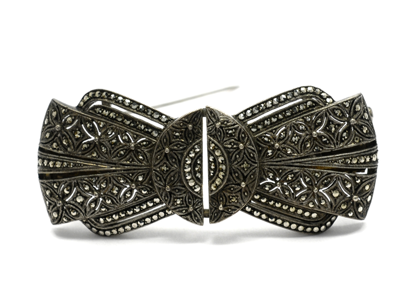 DOUBLE CLIP BROOCH, silver/base metal, marcasites, length 6 cm.