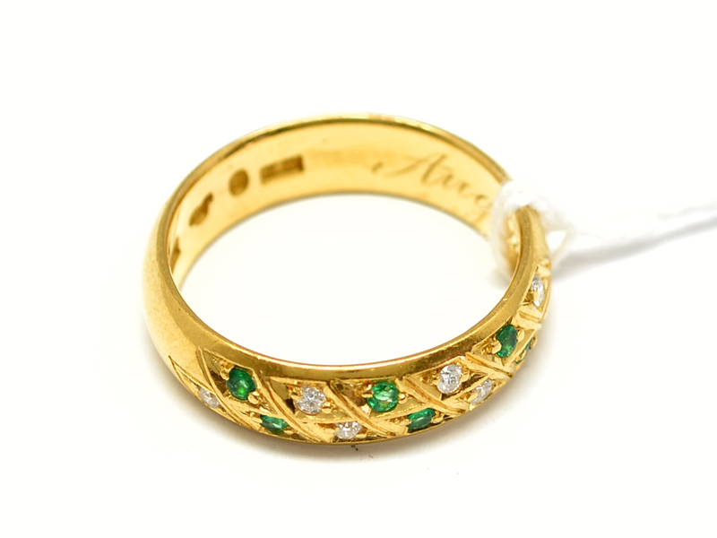 Ring, 23K with green stones o diamonds 6x0,01ct Ø183/4 engraved 8,4g