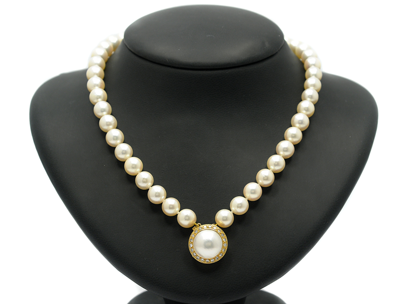PEARL NECKLACE, cultured pearls 9 mm, 18K goldclasp with mabépearl and 21 eight cut diamonds approx 0,42 ctw, approx TW/VS, length 42 cm, 2 medföljande pearls, Jka, case.