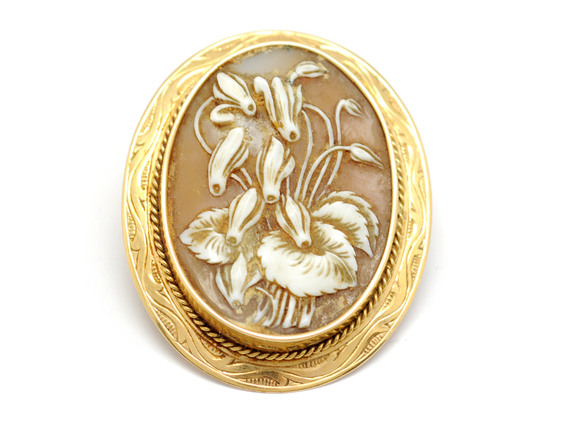 BROSCHHÄNGE, 18K gold, snäckskalscamé utskuret flower motive in relief, Andersson Guldsmed 1956, hängets length 6 cm, broschens measure 5,2 x 4,0 cm, weight 16,1 g.