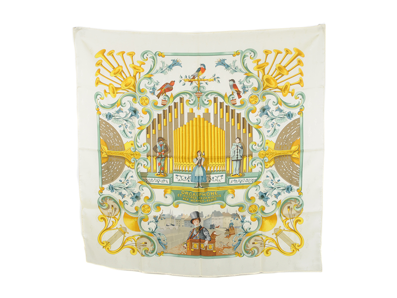 SCARF, HERMÈS, Orgauphones et Autres Mecanique, Francoise Facconet, fr. 1996, 100 % silkes jacquard, Jacquard: G-klav (detta are den enda Hermès design with This jacquard mönster), 90x90 cm, ivory white, gul,grön, nougat. originalask.