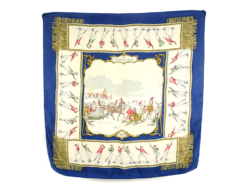 SCARF, HERMÈS, Les Plasirs du Froid, Hugo Grykar, fr. 1955, blue, beige, gold, red.