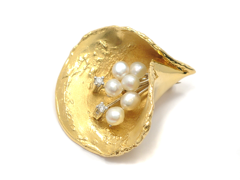 BROOCH, 18K gold, cultured freshwater pearls, 2 brilliant cut diamonds approx 0,06 ctw, weight 14,9 g, length approx 3 cm.