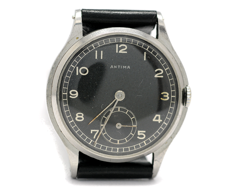 ANTIMA, men´s wristwatch, 30,5 mm, Case no. 15407, steel (staybrite), manual winding, plastic crystal, damaged dial, leather strap, approx 1945.