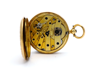 LADIE´S POCKET WATCH, 37,5 mm, Case no. 54987, 18K gold, cylinder escapement, key wind, damaged dial, defect, pattern, dents, approx 1880.