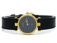 must de CARTIER, VLC, Cal 81, Serial no. 18 068658, ladie´s wristwatch, 24 mm, gilt silver (Vermeil), quartz, mineral crystal, damaged dial, defect, integrated leather strap, original buckle, cert, November, 1985, case.