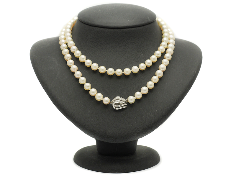 PEARL NECKLACE, cultured pearls approx 7-7,5 mm, somewhat off round, clasp in 18K white gold with 6 brilliant cut diamonds approx 0,08 ctw, approx TW-W/VS-SI, length 75 cm.