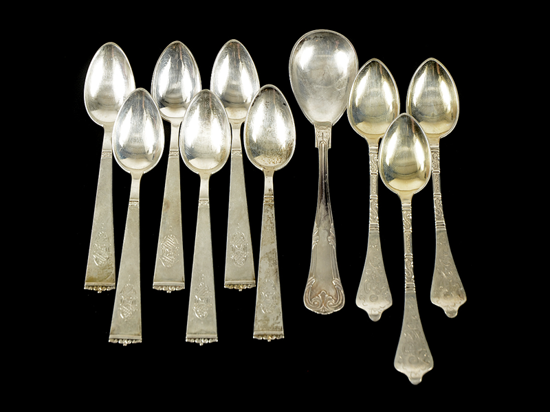 10 Spoons in silver, 118mm-137mm, different modeller 136,7g