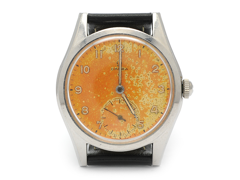 OMEGA, men´s wristwatch, 35,5 mm, Cal 265, Serial no. 11717706, Ref no. CK 2536, Case no. 2536-3, steel (staybrite), manual winding, plastic crystal, small seconds hand, damaged dial, leather strap, approx 1949.