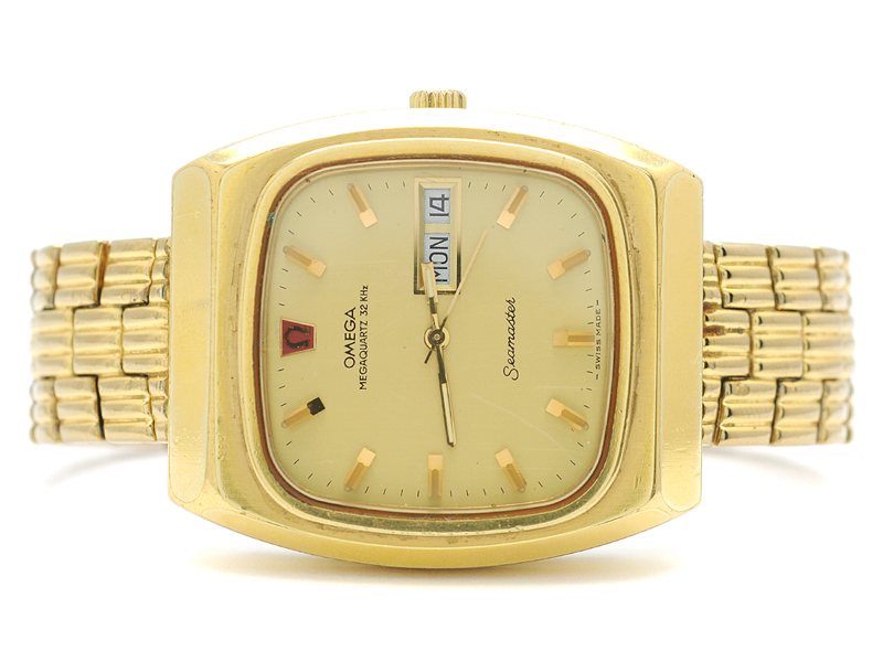 OMEGA, Seamaster, Megaquartz 32 KHz, Cal 1310, Serial no. 37904301, Ref no. MD 196.0023, Case no. 196.0023/396.0817, men´s wristwatch, 39 mm, gold plated (20 micron), quartz, mineral crystal, day, date, damaged dial, defect, damaged case, approx 1973, metal bracelet not original.