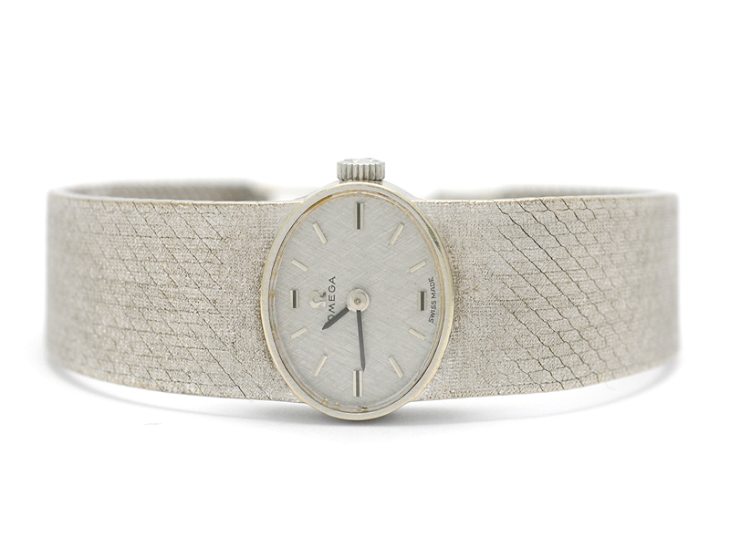 OMEGA, ladie´s wristwatch, 16,5 mm, Cal 484, Serial no. 27300719, Case no. BC8202/B27454, 18K white gold, manual winding, sapphire crystal, damaged dial, integrated original bracelet in 18K white gold, length 142-153 mm, total weight 37,6 gram, approx 1968, case, paper box.
