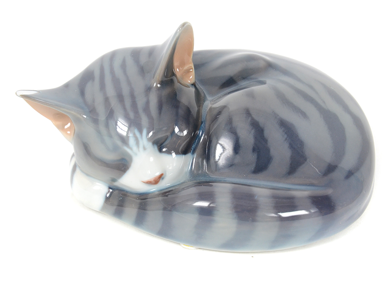 Figure, Royal Copenhagen, sovande cat, damaged öra, width 13cm