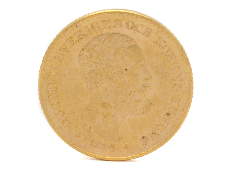 COIN, 21,6K gold, 10 Kronor, 1894, Oscar II. quality approx 01, diameter 18 mm, weight 4,5 g.