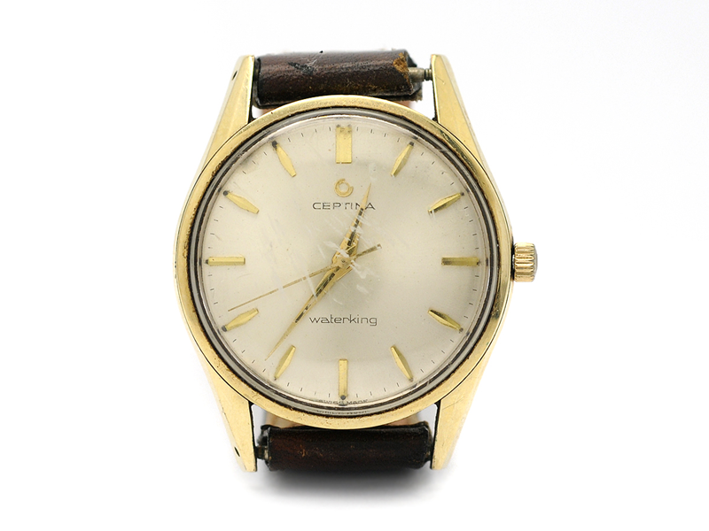 CERTINA, Waterking, Cal 25-36, Ref no. 5127.061, Case no. 5153483, men´s wristwatch, 34,5 mm, gold on steel, manual winding, plastic crystal, damaged dial, leather strap, approx 1959.
