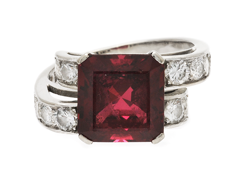 W.A. BOLIN, ring, 18K white gold, red spinel approx 5,50 ct, 14 brilliant cut diamonds approx 0,70 ctw, approx TW(F-G)/VS, Stockholm 1955, size 16,5 mm, weight 6 g, the spinel has one notch and one scratch on the table and one cavity on the pavillion.