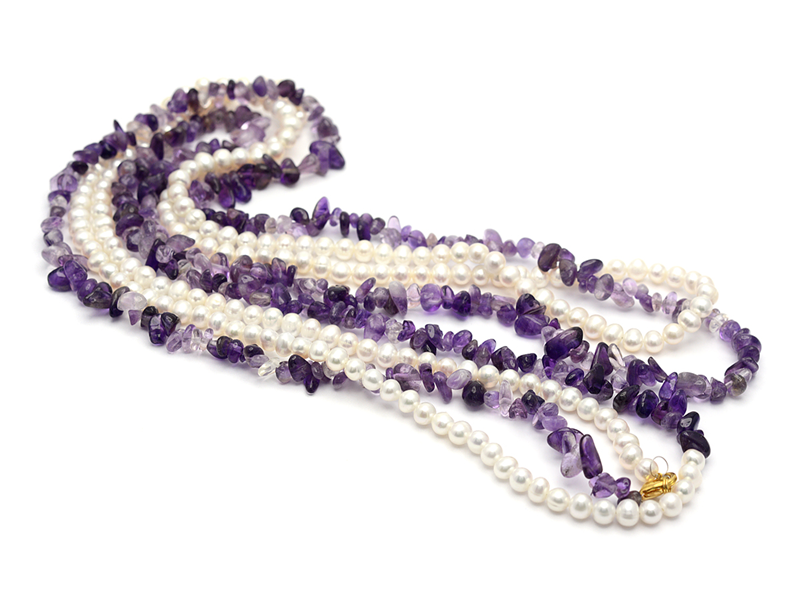 PEARL NECKLACE, cultured freshwater pearls, amethysts, gilt clasp, length 206 cm.